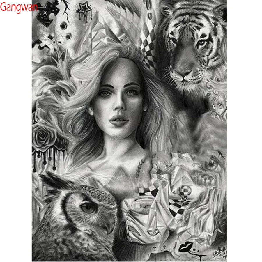 Us 27 42 Off5d Diamond Lukisan Potret Baru Gadis Harimau Burung Hantu Gambar Berlian Imitasi Diamond Mosaik Hitam Putih Seni Penuh Dekorasi Rumah